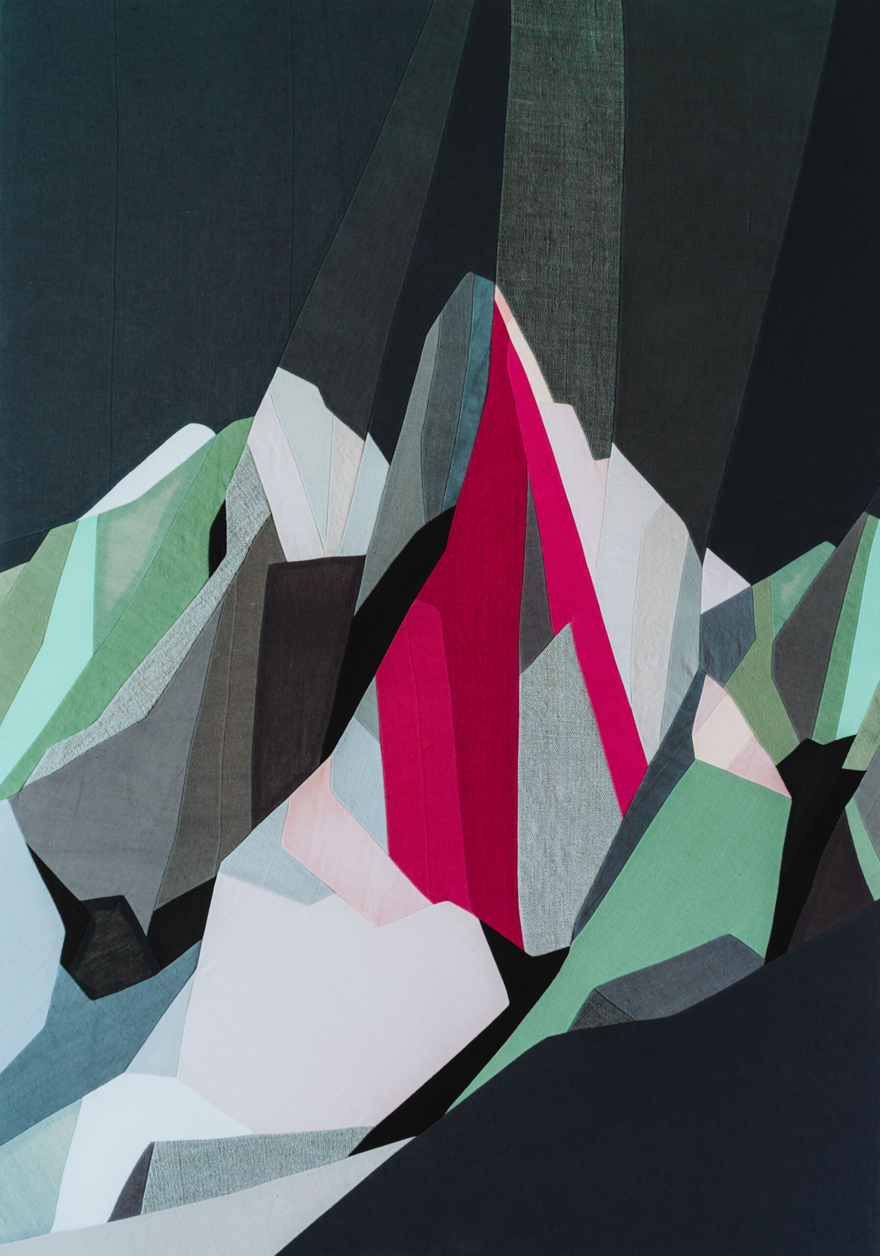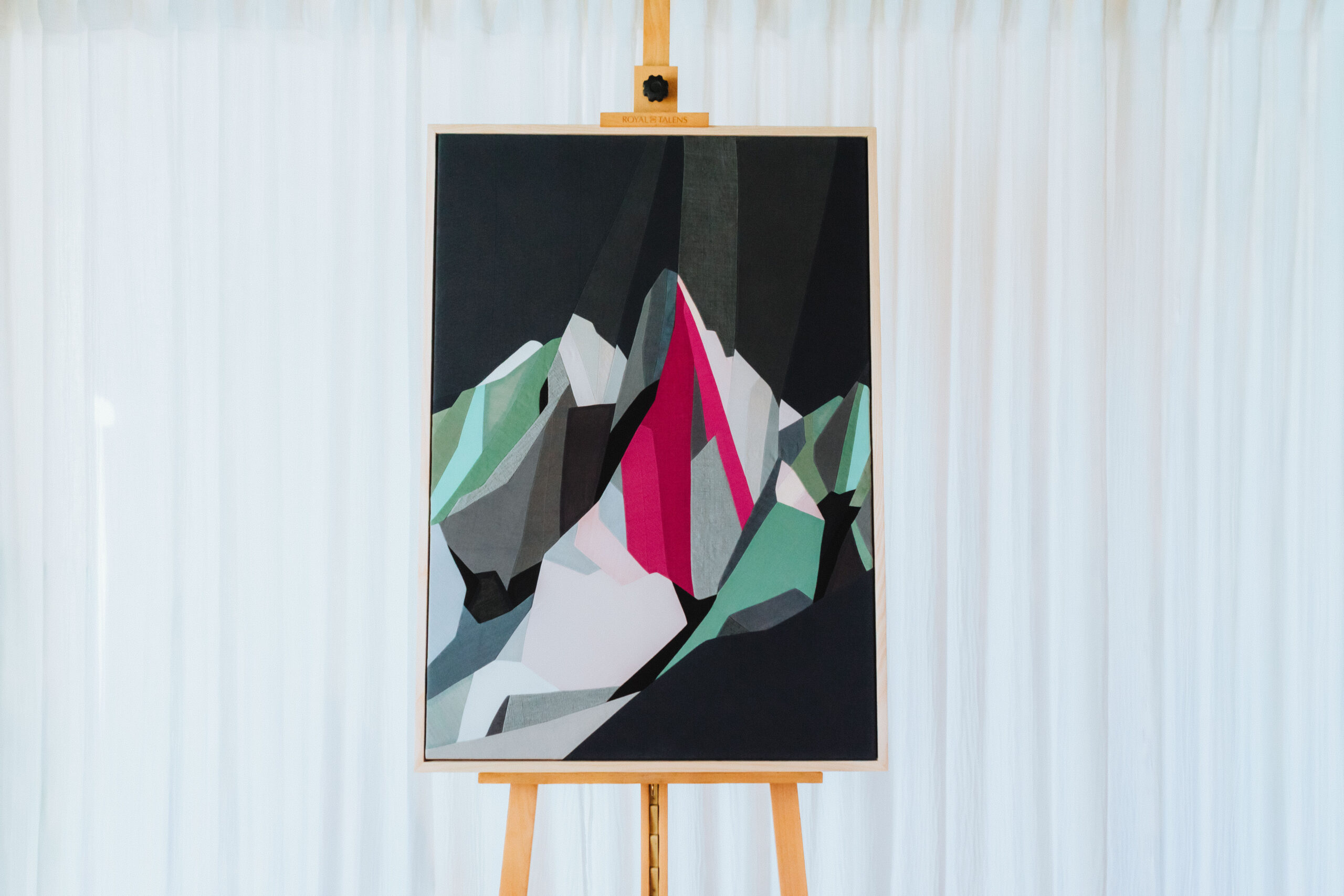 Un savant mélange de tissus naturels soigneusement sélectionnés, recyclés et teints à la main, tendus sur un châssis en bois et toile de coton, afin de préserver l’authenticité et la noblesse de chaque fibre.