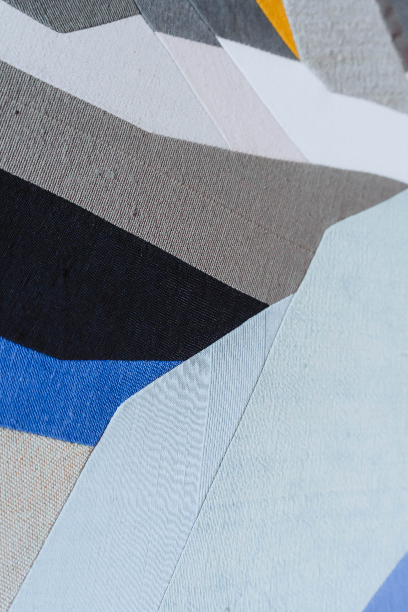 Un savant mélange de tissus naturels soigneusement sélectionnés, recyclés et teints à la main, tendus sur un châssis en bois et toile de coton, afin de préserver l’authenticité et la noblesse de chaque fibre.